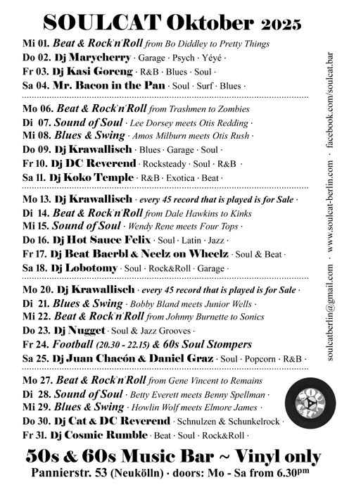 Pannierstr. 53 (Berlin-Neukölln) - Mo. - Sa. ab 18:30 Uhr, CASH ONLY! Für Reservierungen: soulcatberlin@gmail.com Wir zeigen leider keine Sonntagsspiele mehr!